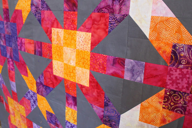 According to that blog post, I looked up the definition of supernova. I liked this definition: "the explosion of a star in which the star may reach a maximum intrinsic luminosity one billion times that of the sun." I liked the explosion of colors, the hot saturation in each block, and the subtle luminosity. I named the quilt Supernova Starburst.