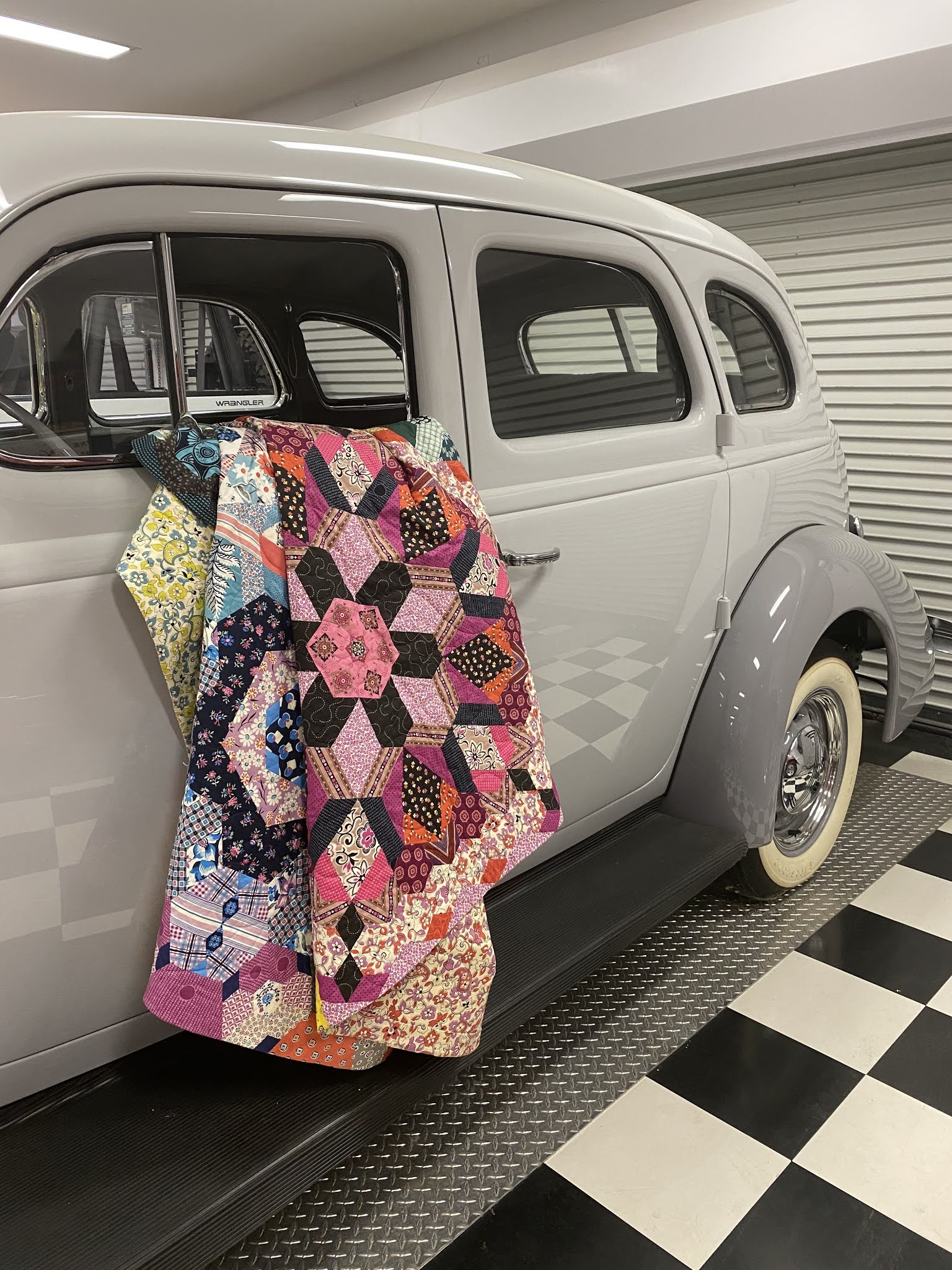 However, the brakes were not working on the day we chose to photograph. The owners offered to roll it out into the driveway but that made me really nervous. So instead we decided on the 1937 Ford. Actually, I think the gorgeous deep red was a better backdrop for the quilt and the home.