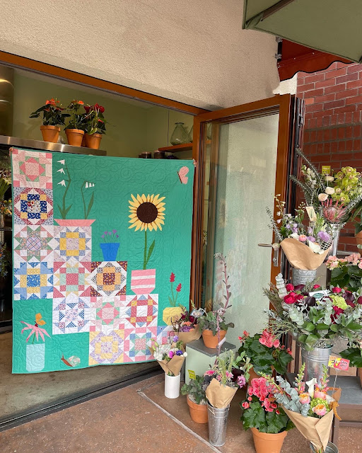 We were in San Luis Obispo (central coast of California) in early November, and while eating lunch I noticed this little flower shop across the street. I had already named the quilt Flower Shop, so what could be more perfect?!
